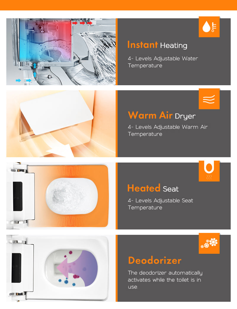 - Auto Flushing: Foot kick automatic flushing, close the lid automatic flushing, but also add deodorant, automatic deodorization. Constant pressure flushing has high stability, strong flushing force and good effect. The flushing noise is lower than that of pulse type, The water consumption for flushing is only 1.32GPF.