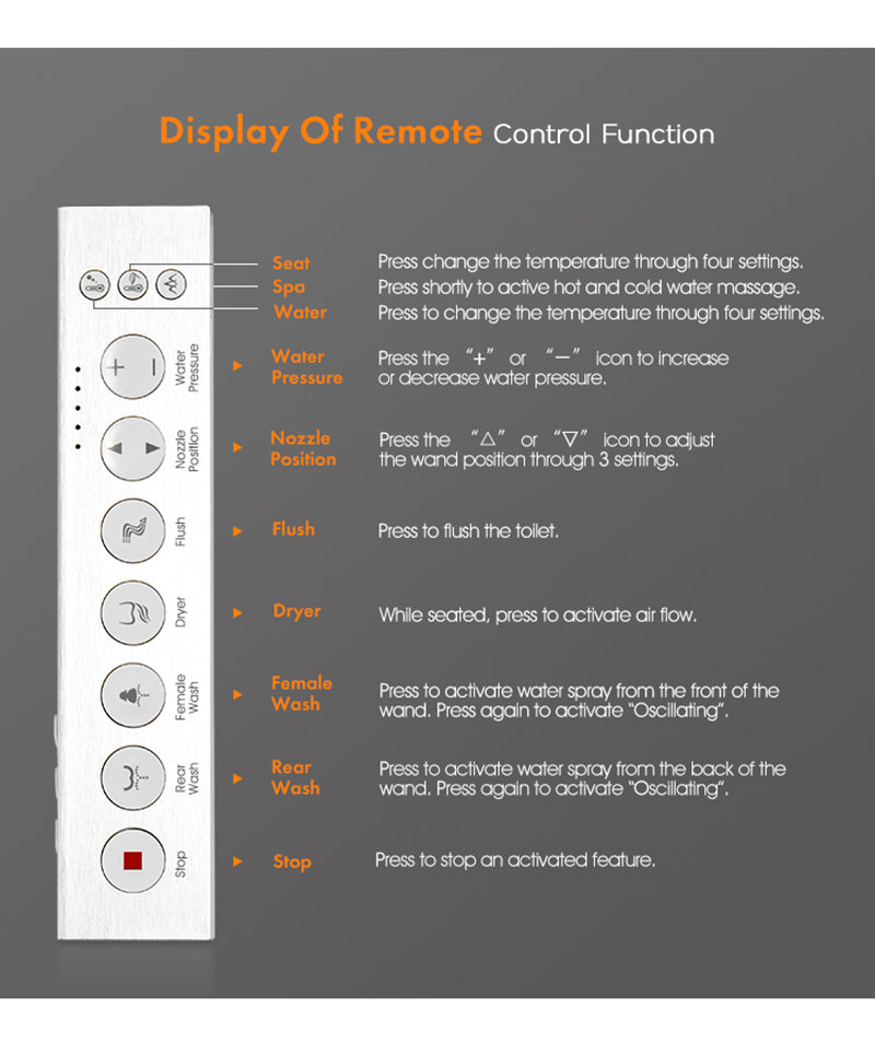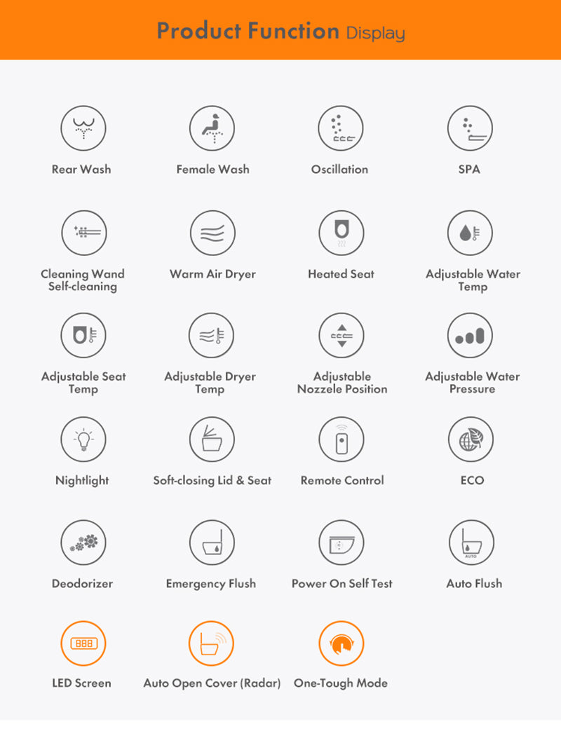 - Multifunctional One Button Knob: Built-in backup battery in the toilet, can start cleaning and flushing in case of power failure.